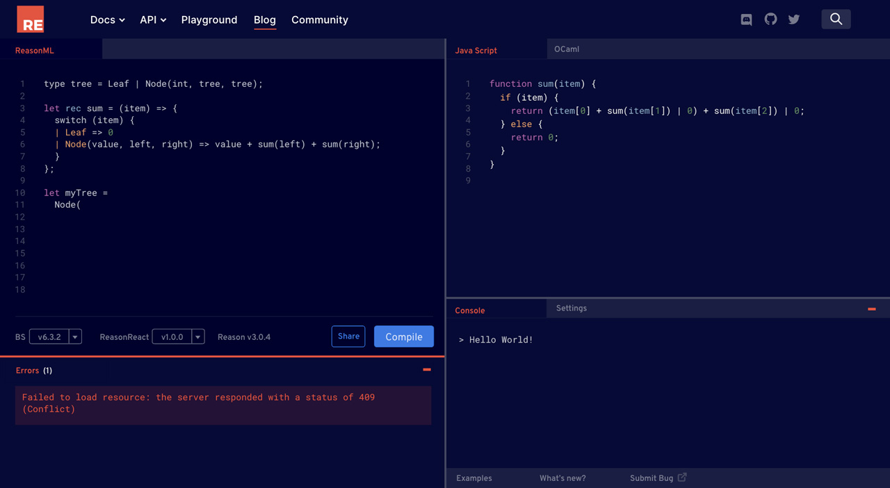 We also invested a lot of time into thinking about the future of the Reason playground from a UX perspective. Our most important goal is to make it possible to switch BuckleScript versions on demand. We also wanted the relevant Reason version to be part of the playground bundle.